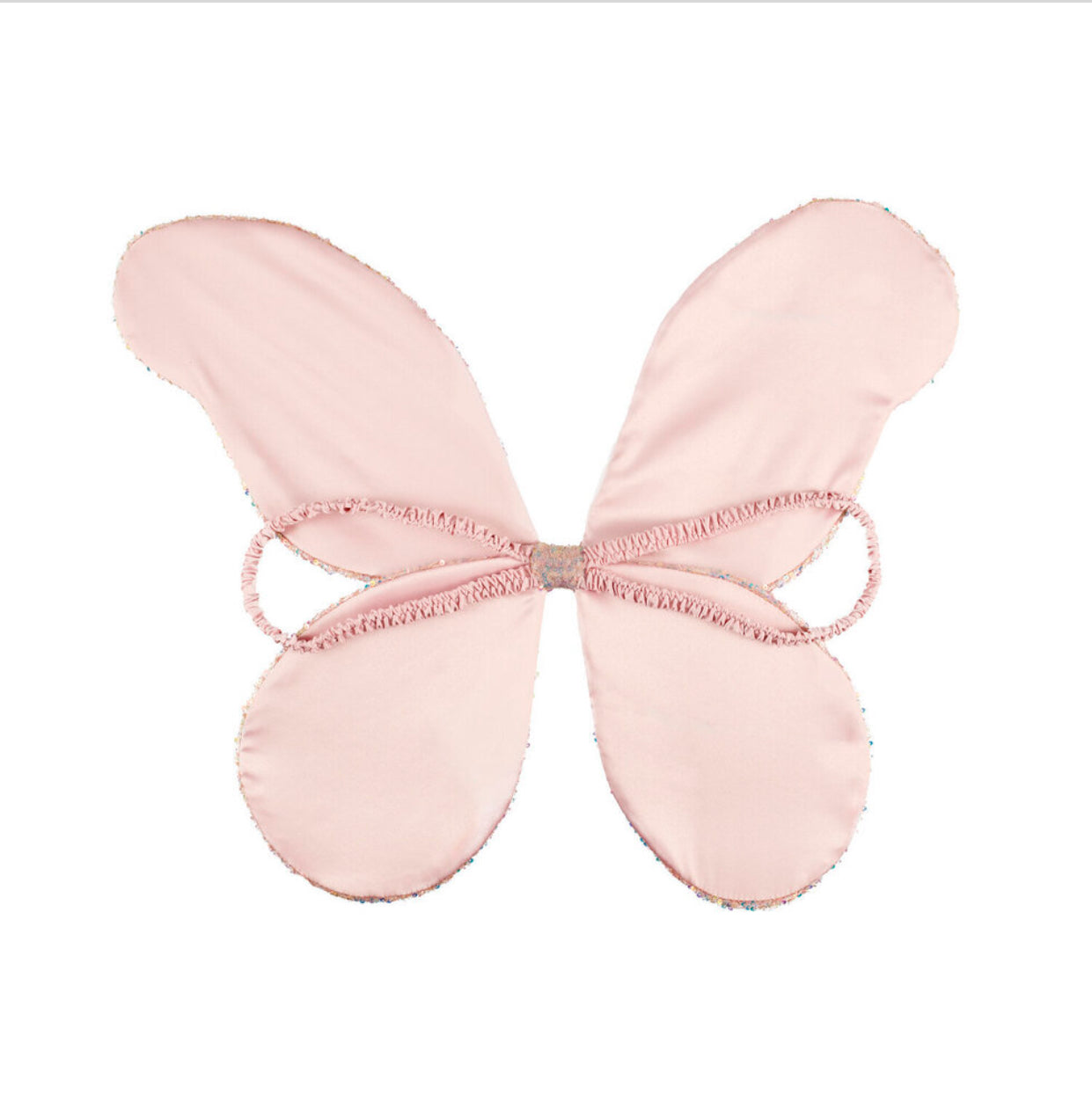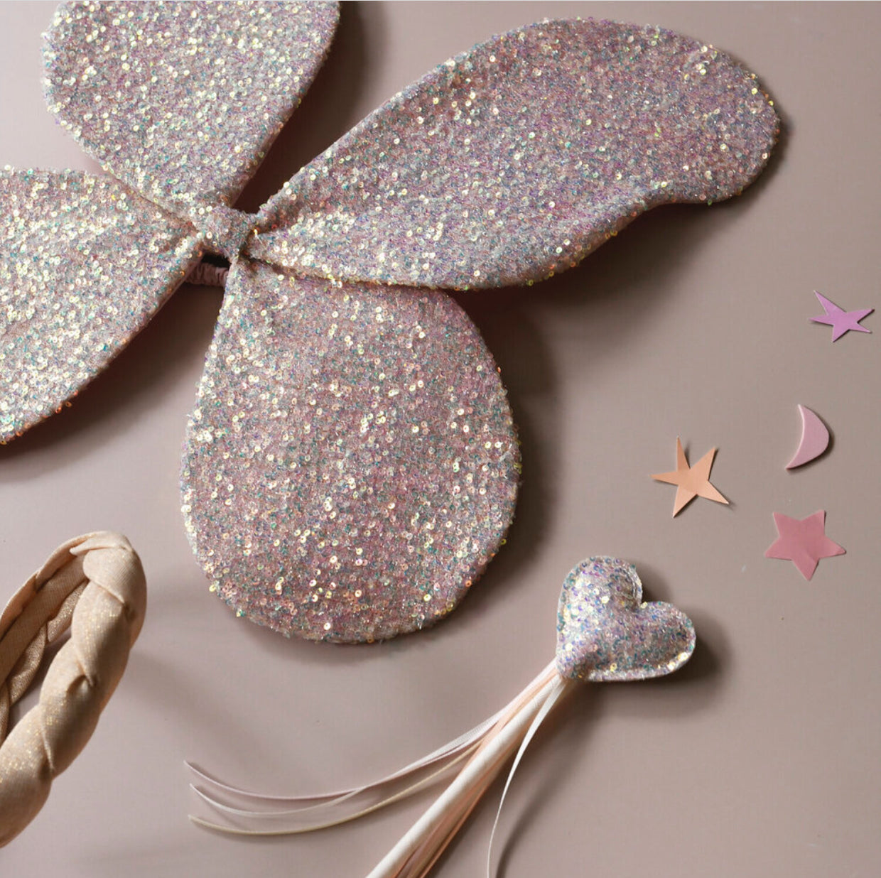 ¡Esparse un poco de polvo de hadas y deja volar su imaginación! Adornadas con preciosas lentejuelas rosas y con un suave satén en la parte trasera, cada par de alas también cuenta con correas elásticas recubiertas de satén, lo que las hace cómodas y fáciles de usar. ¡El accesorio perfecto para pequeñas soñadoras y cazadoras de hadas! Puedes hacer juego con diadema y varita para completar su look!