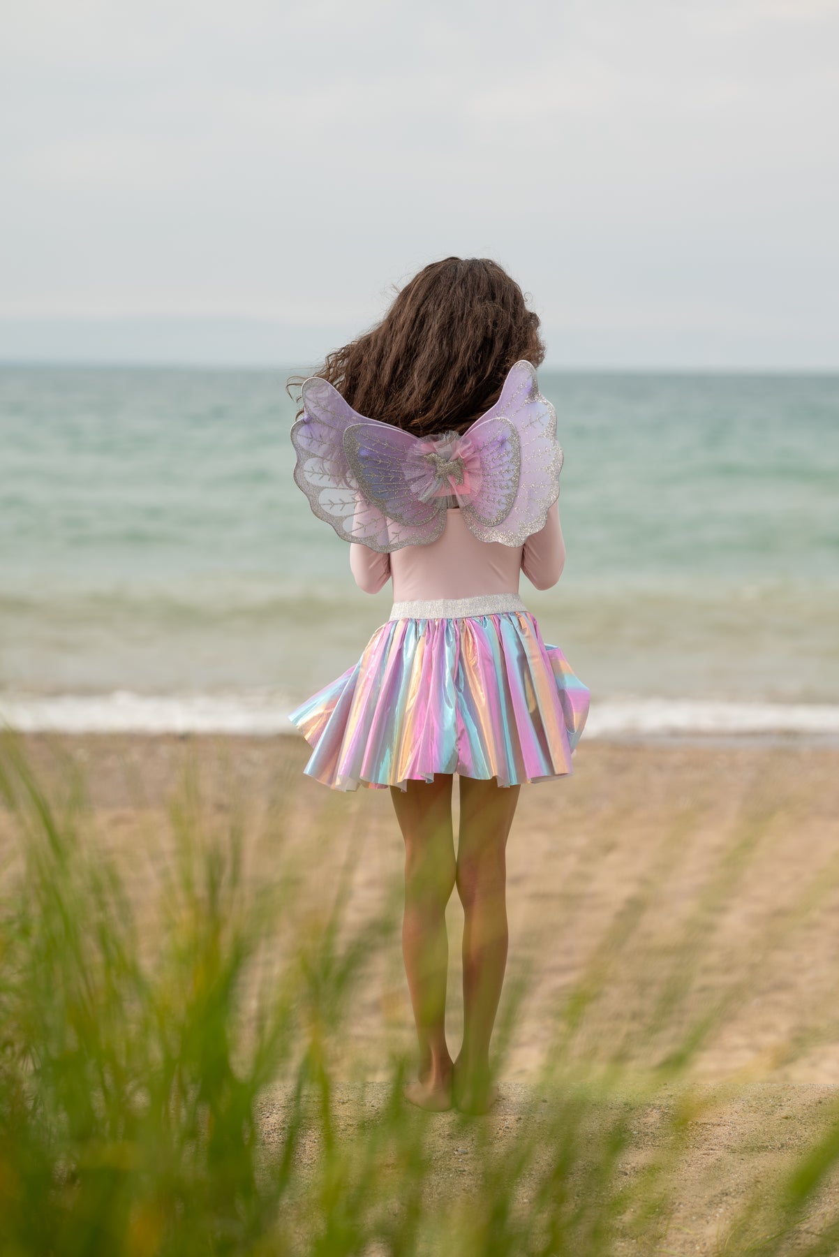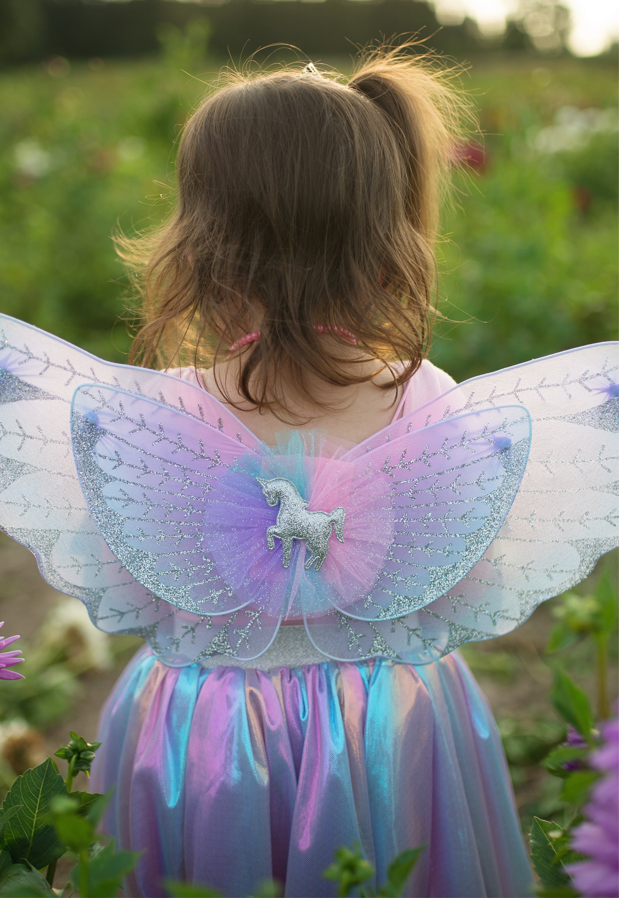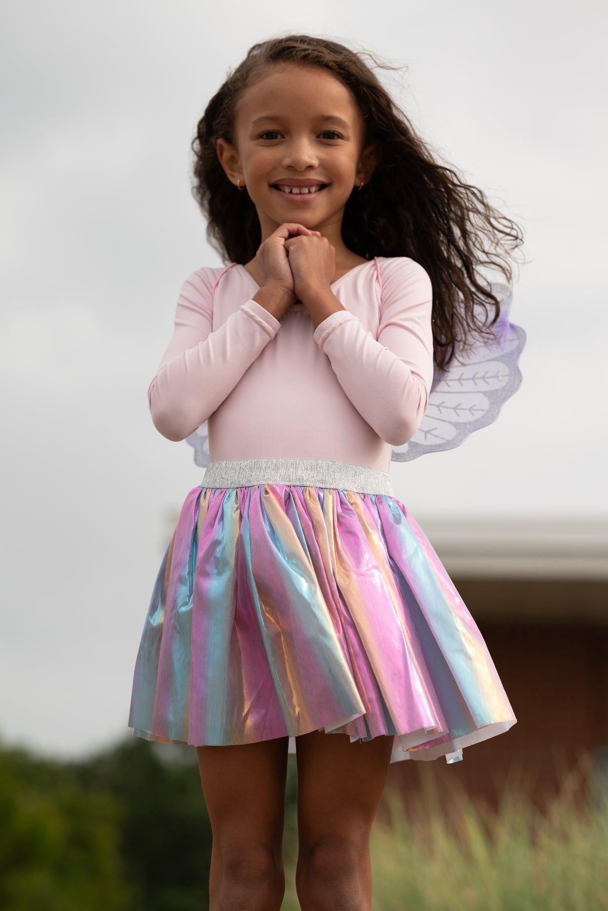 Disfruta de este maravilloso conjunto de falda y alas de Unicornio… Se sentirán realmente mágicos! Las suaves alas lilas están adornadas con calcomanías de purpurina prensada y un encantador unicornio brillante. La falda multicolor y brillante tiene efectos holográficos reflectantes de arcoíris. La cinturilla elástica es suave y cómoda, y ofrece una gran flexibilidad de tallas. ¡La falda es lavable a máquina!
