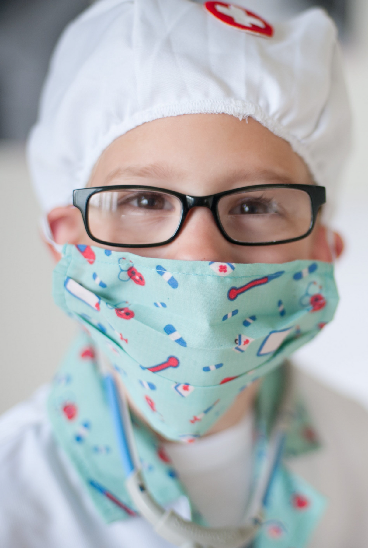 Pack: Set de 8 piezas: Bata, pantalones, mascarilla, gorro, estetoscopio, jeringa, etiqueta y termómetro.