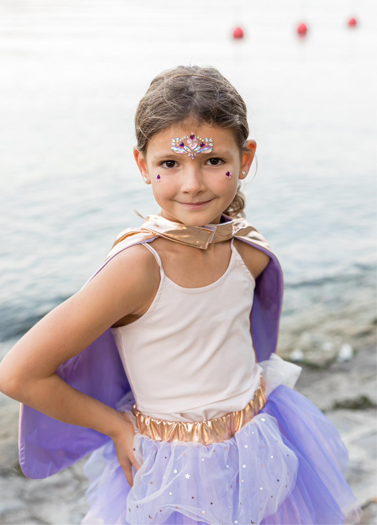 La estrella de la parte posterior de las capas están bordados alrededor de los bordes para un bonito acabado. La capa en color rosa metalizada con cierre está forrada para un acabado completamente elegante. Con cintura dorada hace juego con el resto del traje. Las faldas tienen un peplum y dos capas de tul con una fantástica capa de forro inferior metálico arrugado. Las máscaras son de doble cara para que coincida perfectamente con el conjunto.