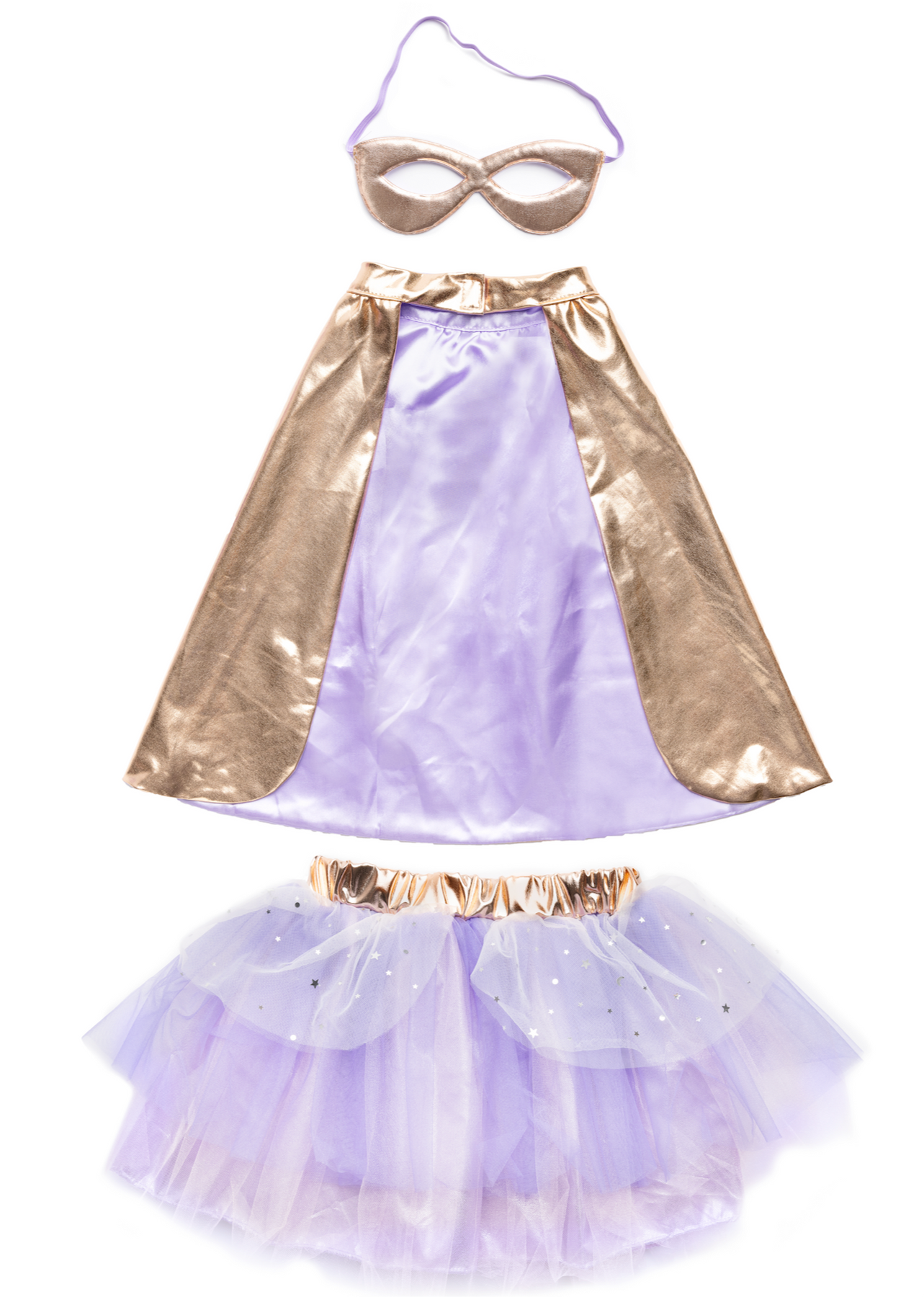 Pack: 1 Capa, 1 antifaz y 1 falda color lila iridiscente