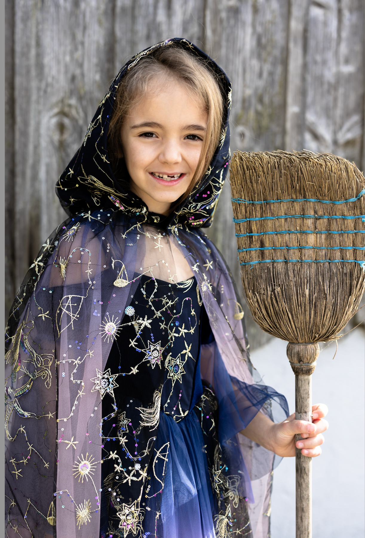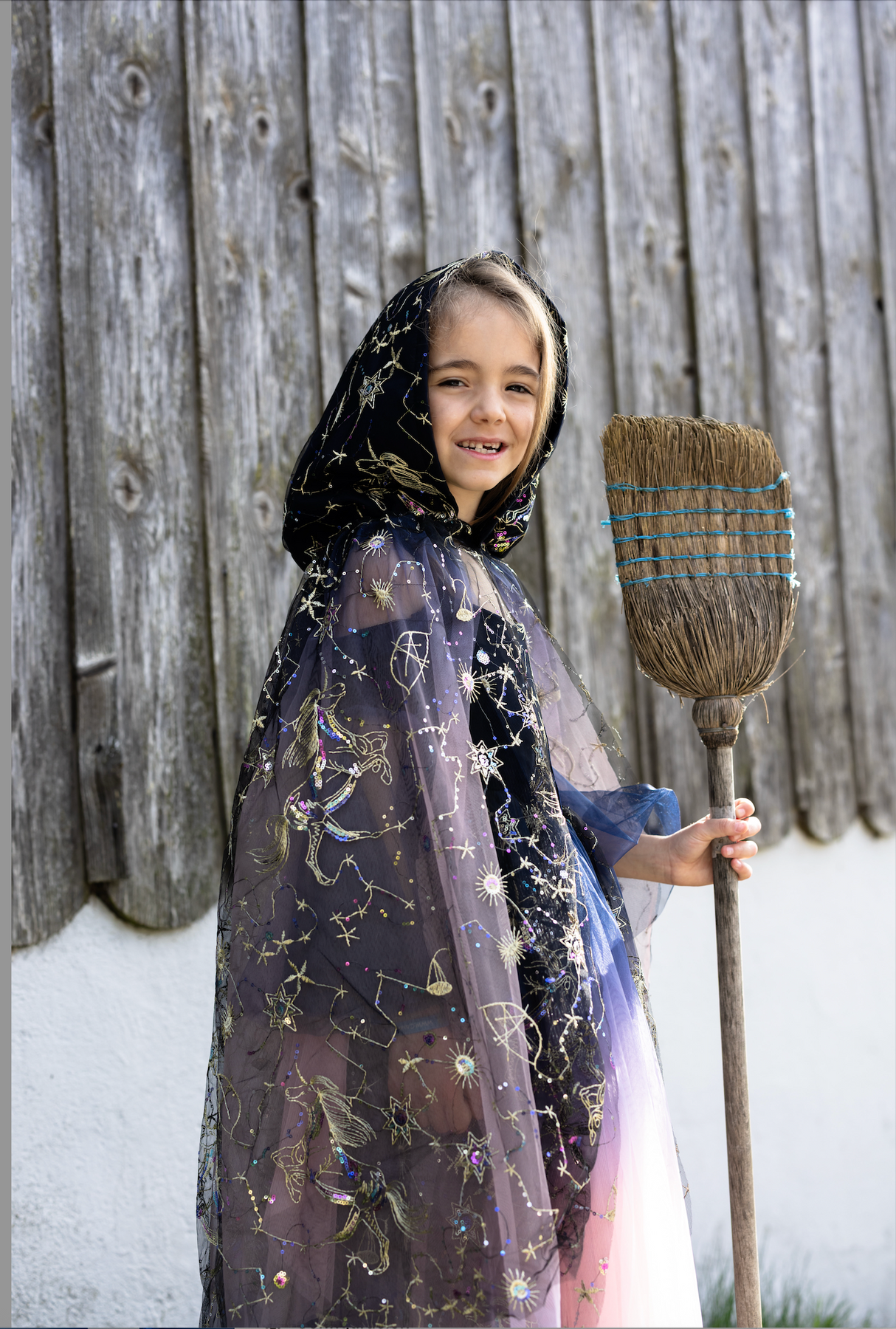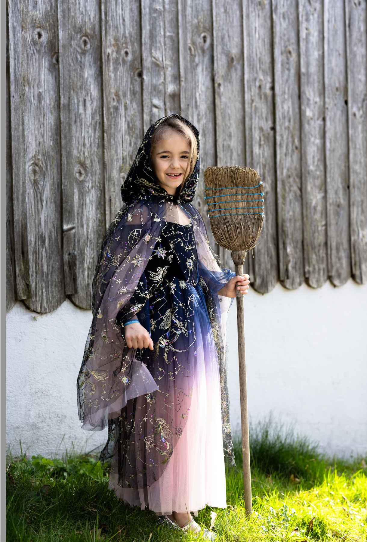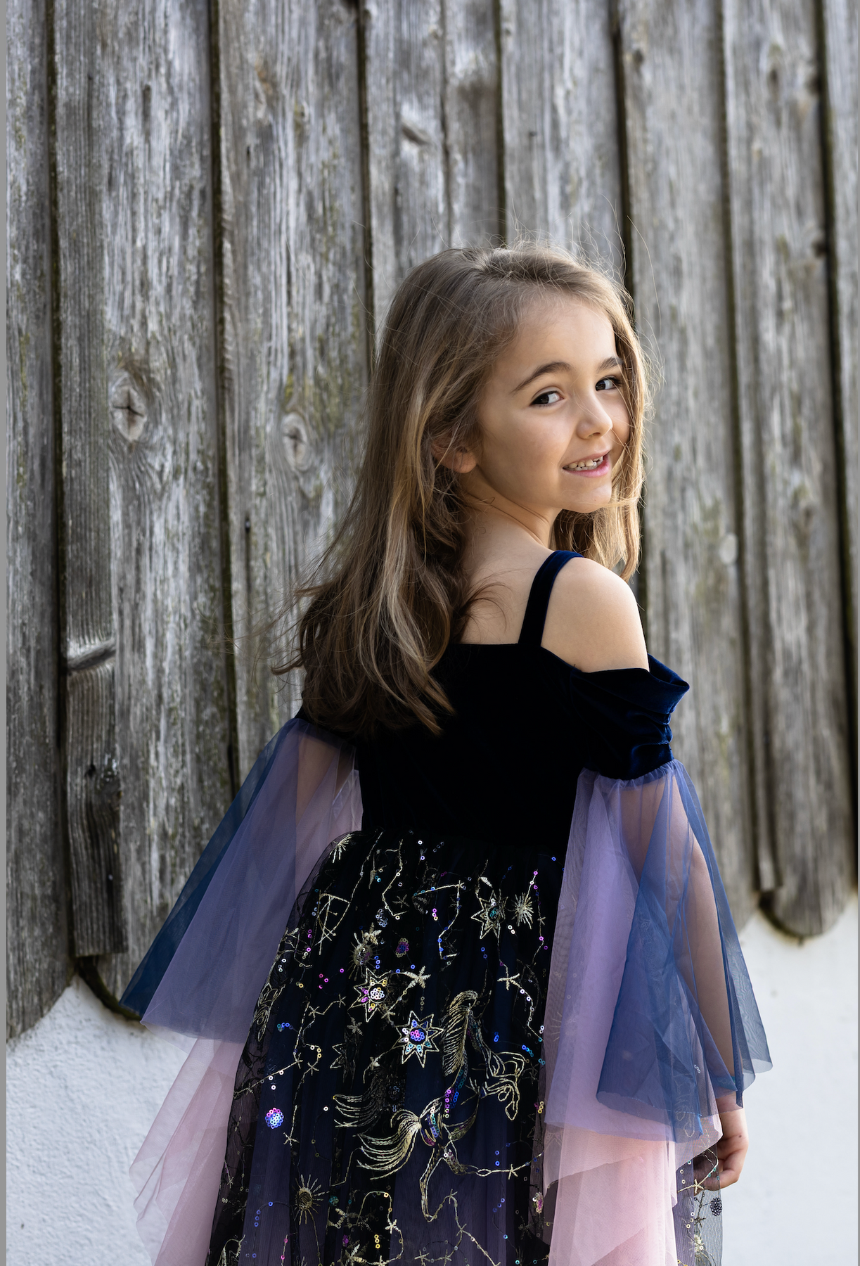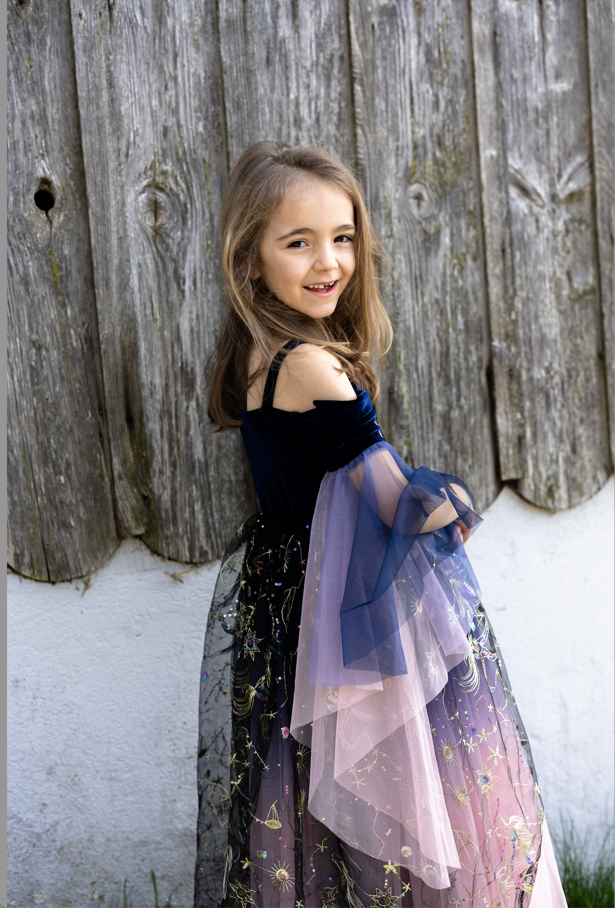 Convierte a tu pequeña en una reina celestial con este impresionante Vestido de Hechicera Crepuscular: una magnífica mezcla de polvo de estrellas, sueños y giros. Diseñado para cautivar, con un corpiño de tela morada oscura bordada con estrellas doradas y delicadas constelaciones que brillan a cada paso. Las mangas de terciopelo suave con hombros descubiertos le dan un toque real, a la vez que son lo suficientemente cómodas para horas de juego mágico. ¿La verdadera maravilla? ¡La falda vaporosa de tul ombré, que se desvanece de un intenso morado crepuscular a un suave rosa empolvado!