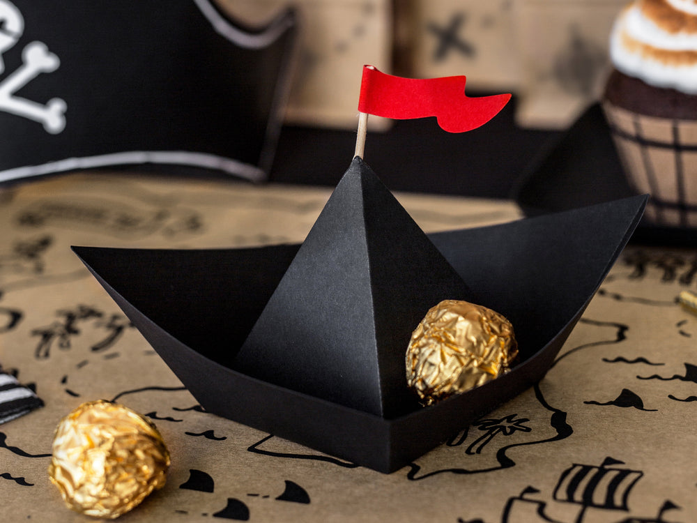 Original recipiente en forma de barco pirata color negro, lo puedes utilizar para decorar tu mesa y rellenar con candies y snacks de tu fiesta. Quedarán muy bonitos y le darán un toque muy original a tu mesa a la vez que funcional.