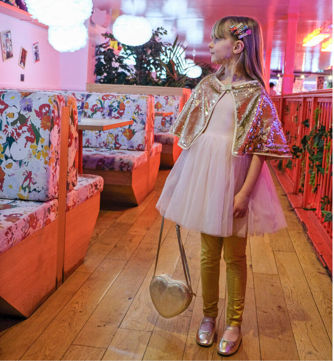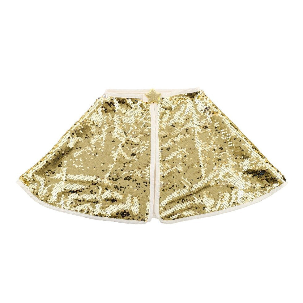 ¡Prepárate para deslumbrar con nuestra capa de lentejuelas doradas! Adornada con lentejuelas doradas y con un cierre de velcro con estrellas doradas brillantes. Completamente forrada con estrellas doradas y ,¡es reversible para el doble de diversión! ¡El accesorio perfecto para las fiestas! También podrás hacer juego con cartera y accesorios de cabello! Se verá espectacular...