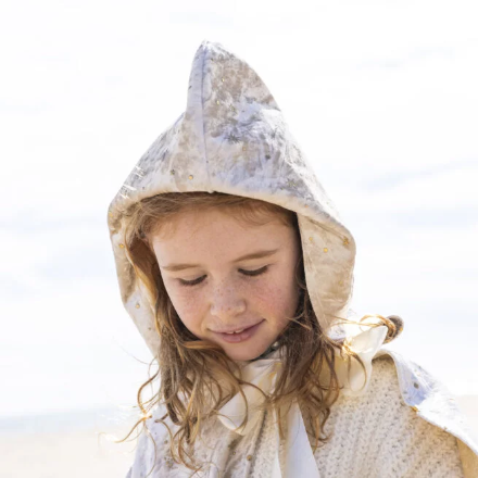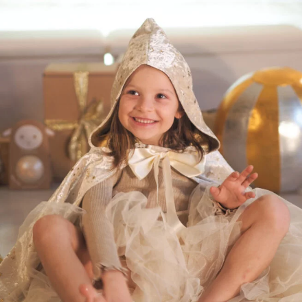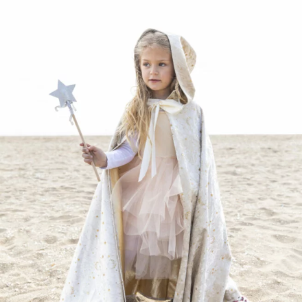 Esta encantadora capa larga con capucha es el accesorio perfecto para transformar a tu hija en un ser mágico. Adornada con estrellitas doradas que brillan como constelaciones. La Capa de Hada está diseñada para despertar la imaginación de tu hijo y permitirle vivir fantásticas aventuras. Para mayor autonomía y facilidad de uso, esta capa se ata con un cierre de velcro ingeniosamente oculto bajo un bonito lazo de satén. Se puede poner y quitar sola.