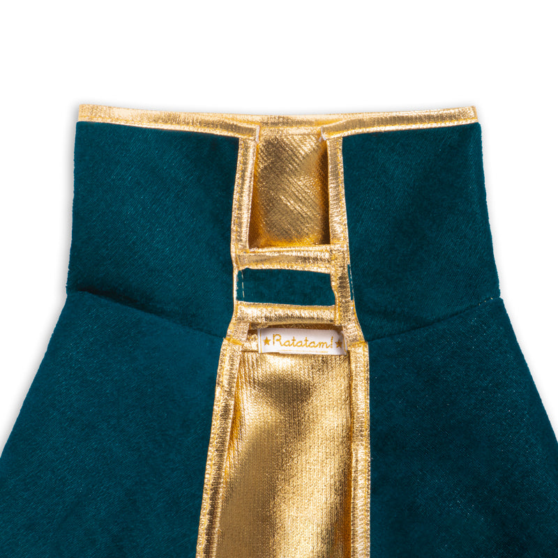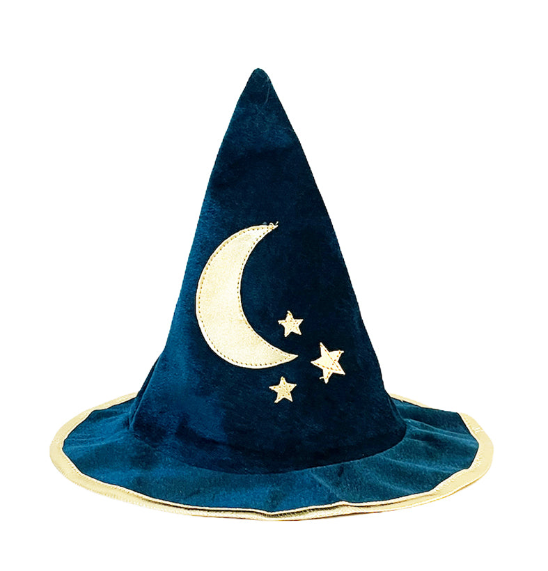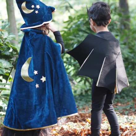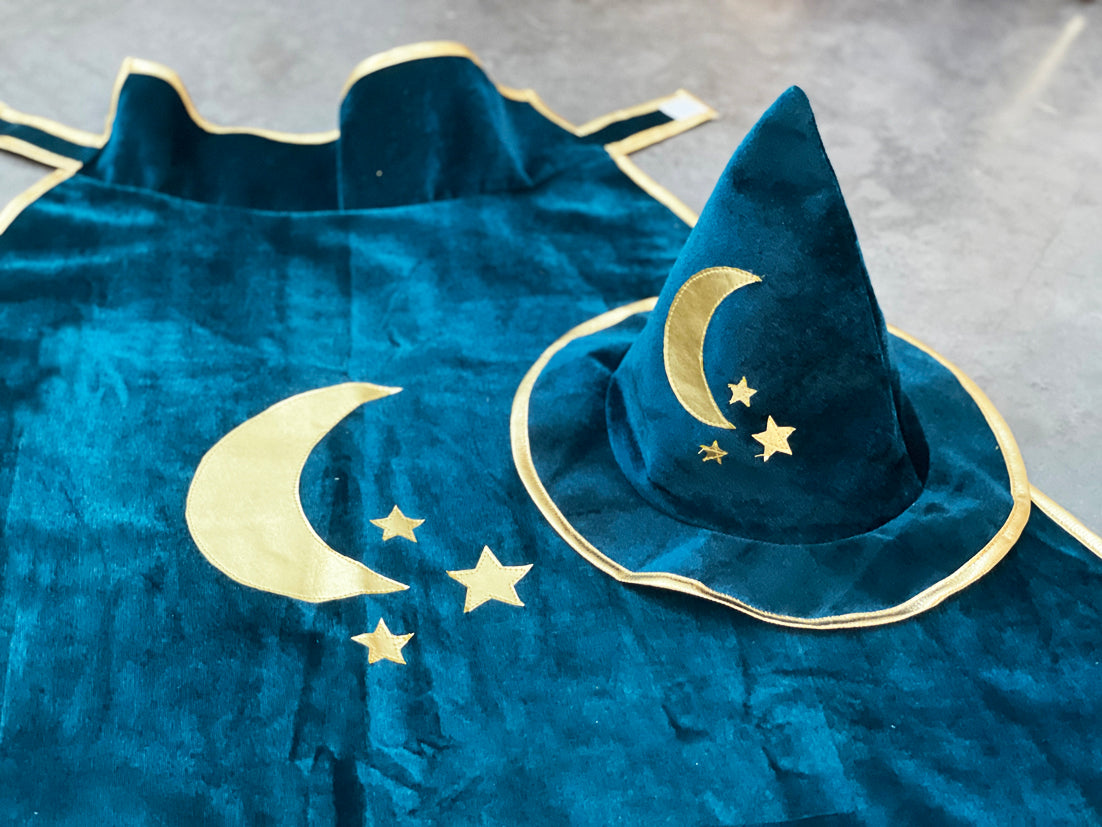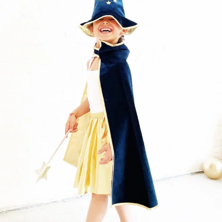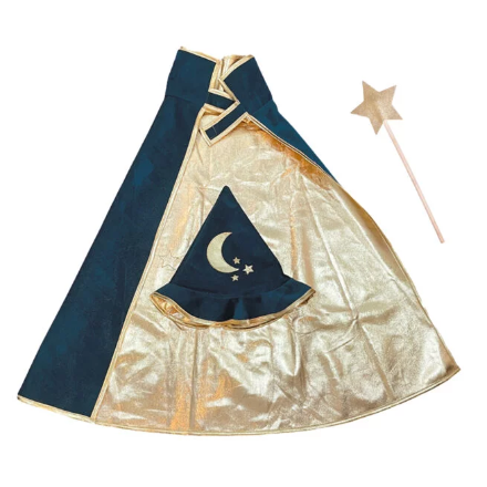 El kit completo de mago: ¡capa + sombrero + varita! ¡Los artículos esenciales en el baúl de disfraces! La capa de mago está hecha de terciopelo azul royal con forro dorado. La capa se ata al cuello con un sistema de velcro color azul royal.