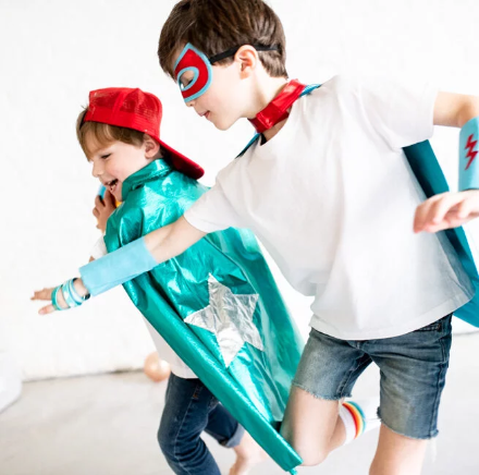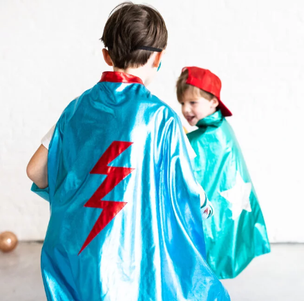 Absolutamente ideal este disfraz de superhéroe con capa azul con un rayo dorado y antifaz con muñequeras a juego en color azul y toques dorados. Todo está decorado con rayos y glitter a juego. ¡Un regalo perfecto para un superhéroe!