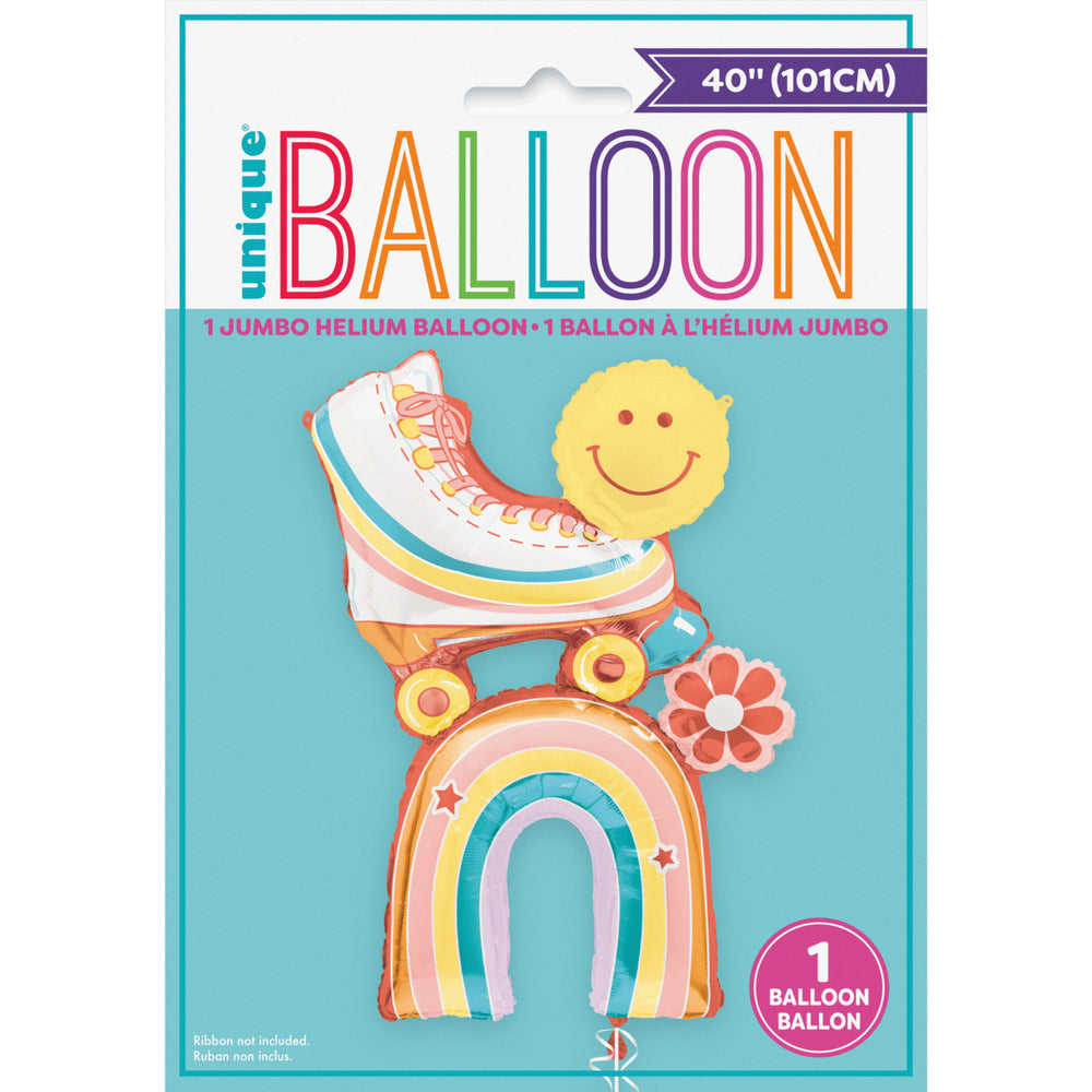 ¡Perfecto para un cumpleaños o una fiesta retro! El globo tiene un arcoíris, un patín, una flor y una carita feliz, uno encima del otro. El globo tiene hermosos colores pastel. tiene una  "supershape" y mide 101 cm. ¡Descubre nuestros globos, decoraciones y otros artículos de mesa para crear el ambiente perfecto!