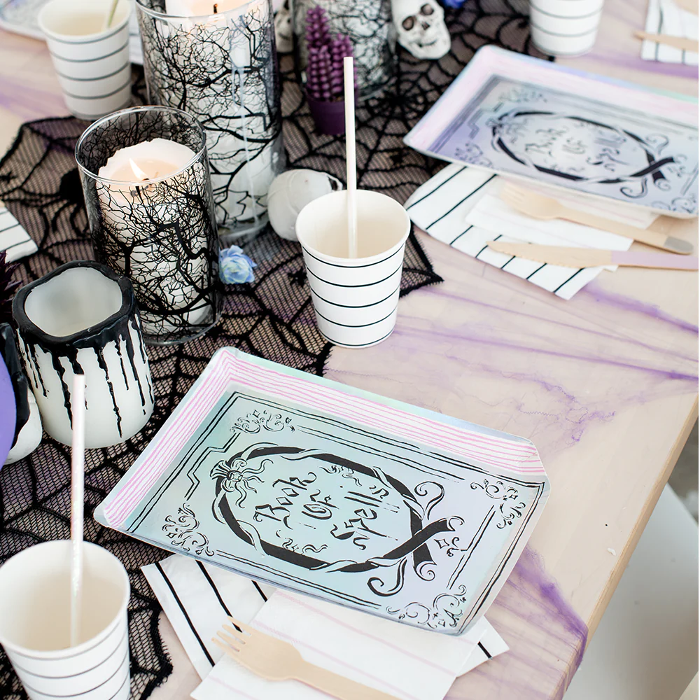 Con hechizos, algo se está cocinando en la olla! Con elementos holográficos de papel plateado y tonos morados y grises, ¡estos platos grandes de Halloween nos han hechizado!