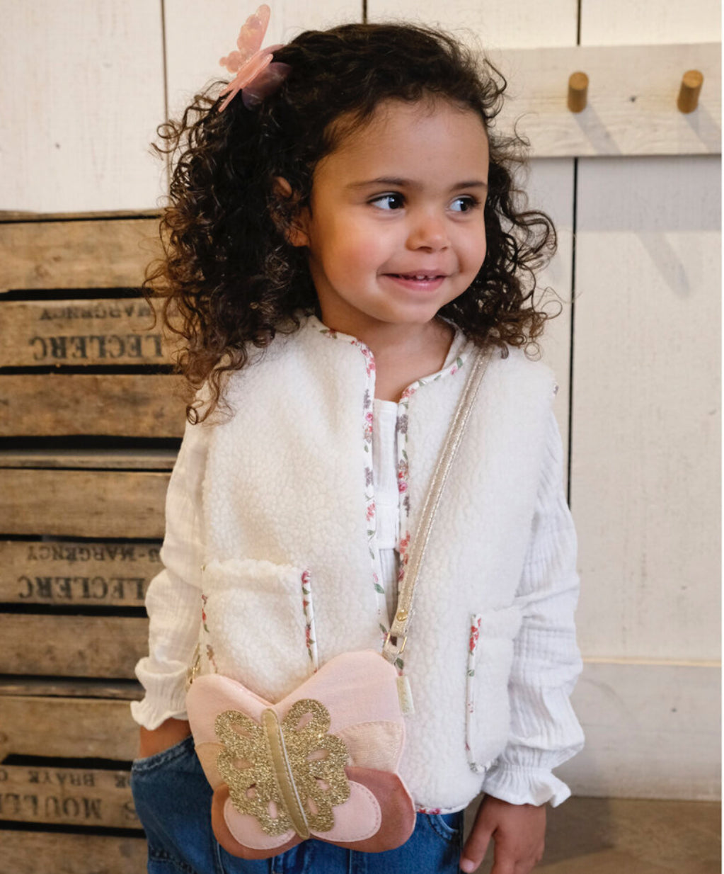 Nuestro divertido bolso de mariposa con patchwork está confeccionado con telas en tonos neutros y rosa palo, con preciosos detalles de purpurina dorada y poliuretano. Cuenta con un cierre magnético de puntos, está completamente forrado y una correa dorada ajustable con punto de seguridad.