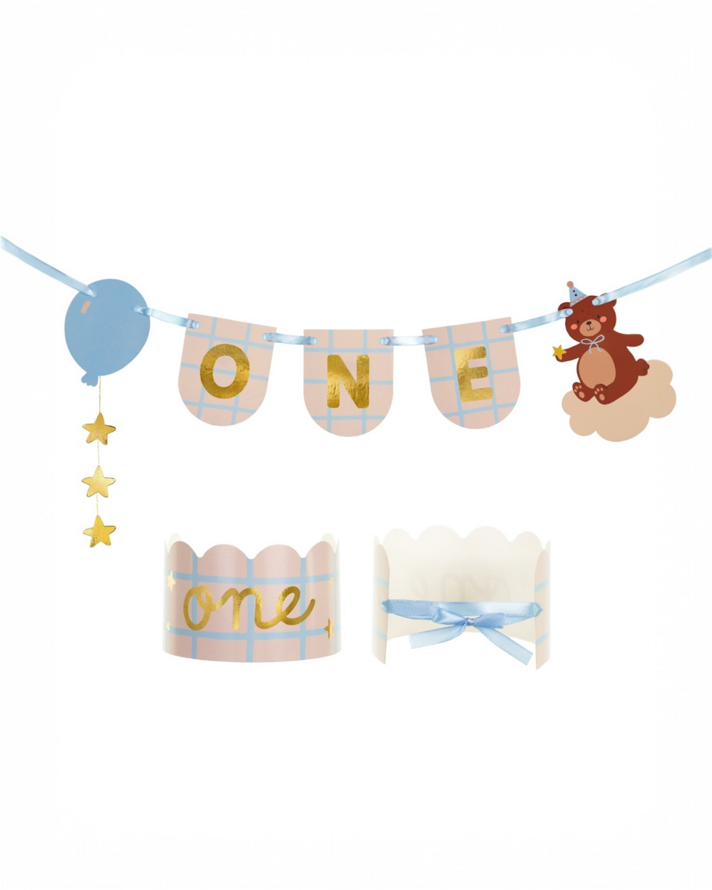 Completa la decoración de su primer cumpleaños con esta guirnalda de osito de peluche con letras doradas ONE e incluye corona para el festejado con inscripción ONE. Puedes hacer juego con vela y globo de osito con su gran numero 1.