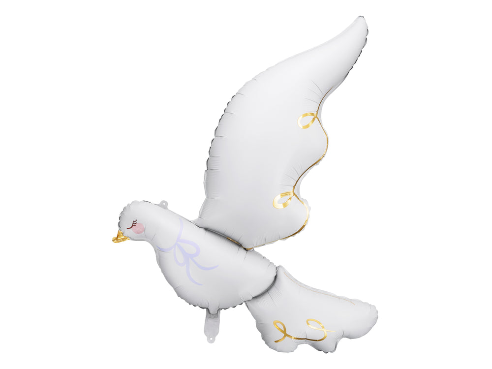 Globo de aluminio en forma de paloma blanca con detalles en color dorado ideal para decorar la mesa en la primera comunión o bautizo. Puedes inflarlo con helio o con aire. Puede flotar en tu fiesta, colgar del techo o pegarlos en una pared...de cualquier manera se mirará hermoso!