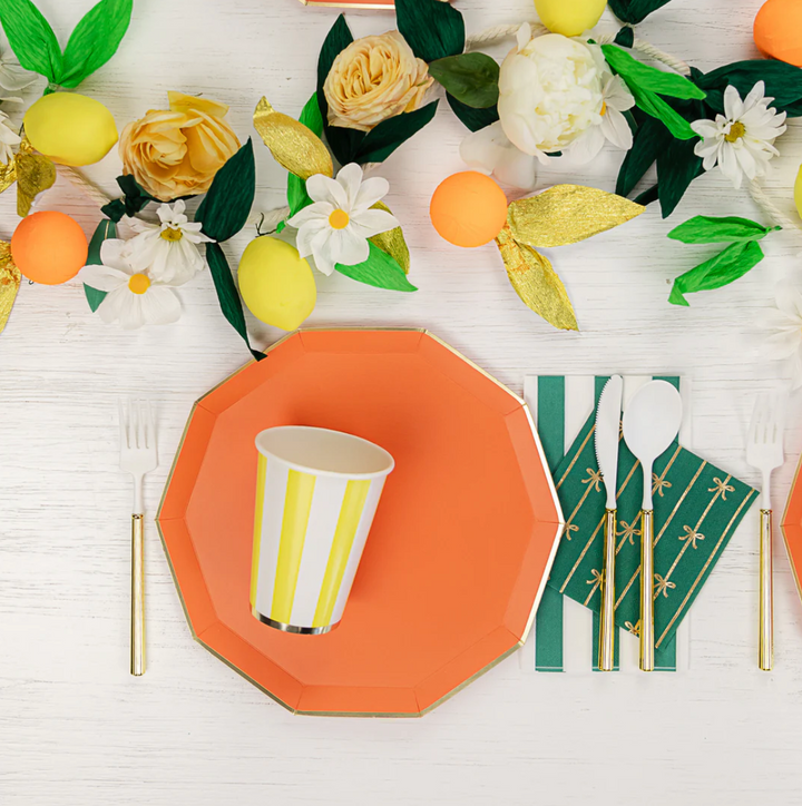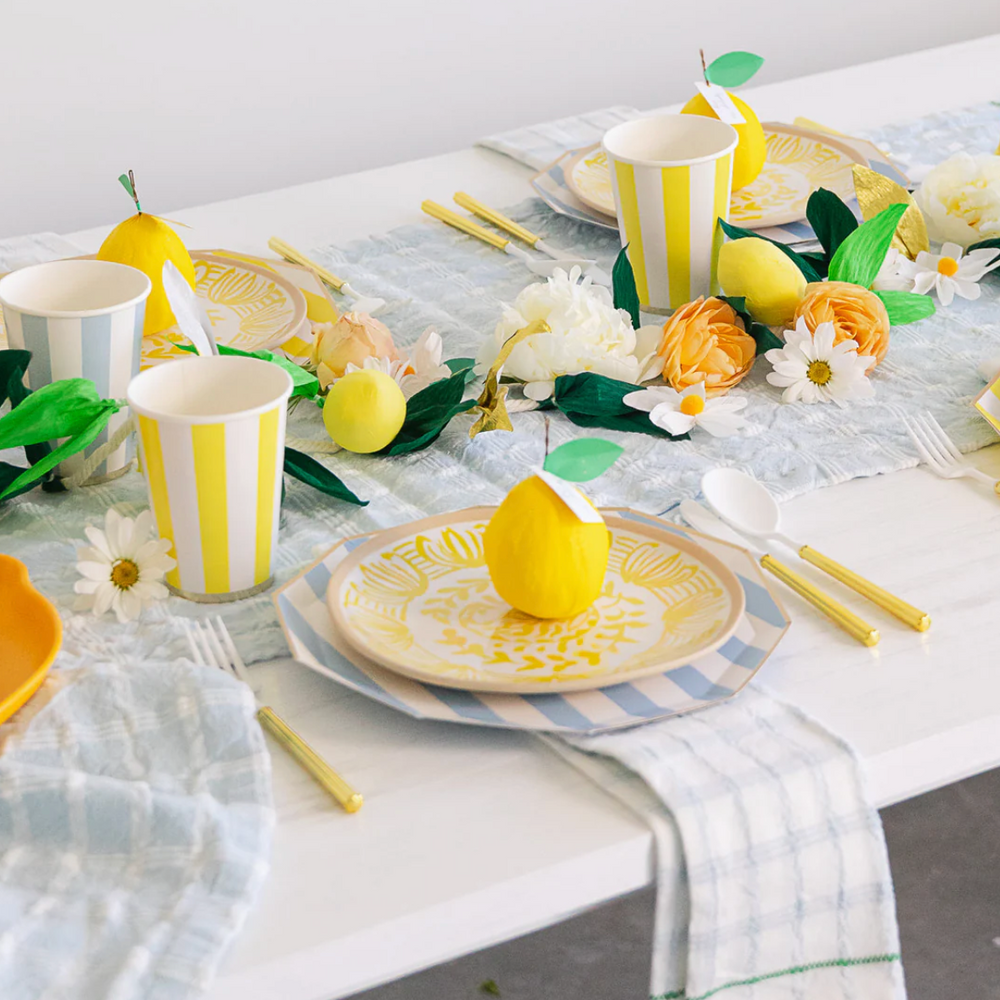 Disfrute y añada un toque de sofisticación con nuestros vasos a rayas cabana amarillo con un elegante diseño de rayas anchas. Perfectos para baby showers, cumpleaños o cualquier ocasión. French design by Bonjour Fête.
