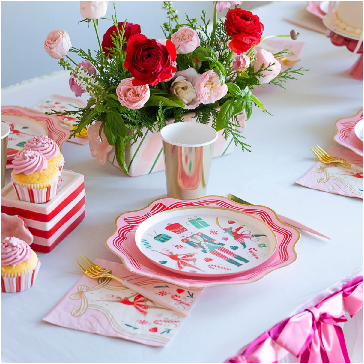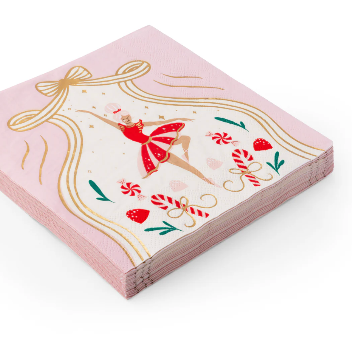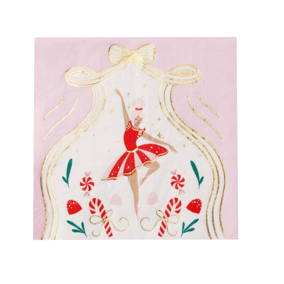 Estas servilletas rosas presentan un elegante diseño de bailarina con un lazo dorado, lo que las hace perfectas para eventos con temática de Cascanueces o fiestas inspiradas en el ballet. Son ideales para celebraciones navideñas o cumpleaños con temática de ciruelas dulces, creando un ambiente encantador que tus invitados disfrutarán. Combínalas con nuestros Platos de Postre Cascanueces para una decoración de mesa coordinada.